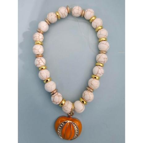 Agate gemstone beads. Beigh variegated beads. Gold plated flat round spacer beads Orange and gold plated pumpkin charm Stretch.